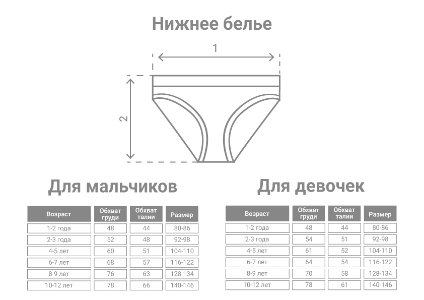 Для покупки нижнего белья необходимо знать обхват бедер ребенка и высоту изделия, для маек, топов и боди также нужно знать параметры обхвата груди. Следует учитывать, что у мальчиков и девочек указанные параметры различаются, особенно эти отличия становятся более явными к 10 - 12 годам.